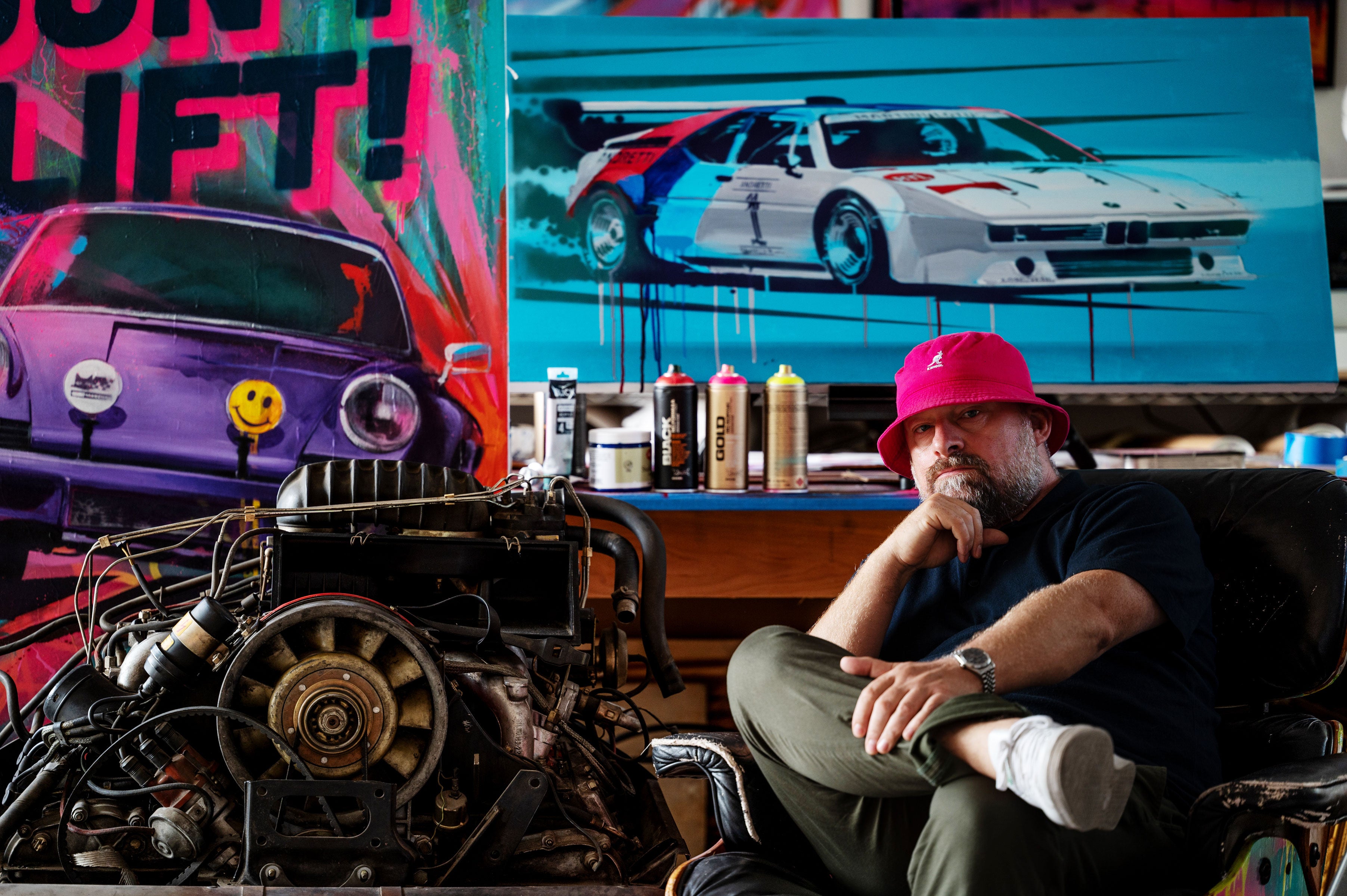 Felix works from his home in Venice Beach California, his art sharing space in his studio with a 31 Ford Hotrod and Porsche 911 project, allowing him to paint and build cars simultaneously.